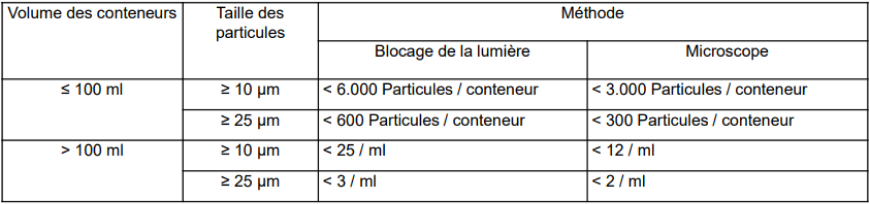 Cela détermine les particules « invisibles » (granulométrie mesurée : 10 µm et 25 µm) qui ont été introduites involontairement dans des liquides (par exemple des solutions et des récipients) à la suite d'une contamination par des particules étrangères non dissoutes (une exception à cette règle concerne les bulles de gaz).